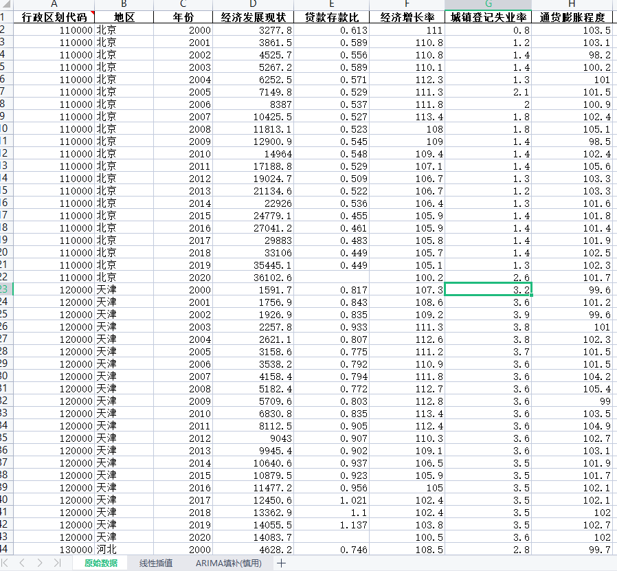 计算结果:行政区划代码、地区、年份、经济发展现状、贷款存款比、经济增长率、城镇登记失业率、通货膨胀程度