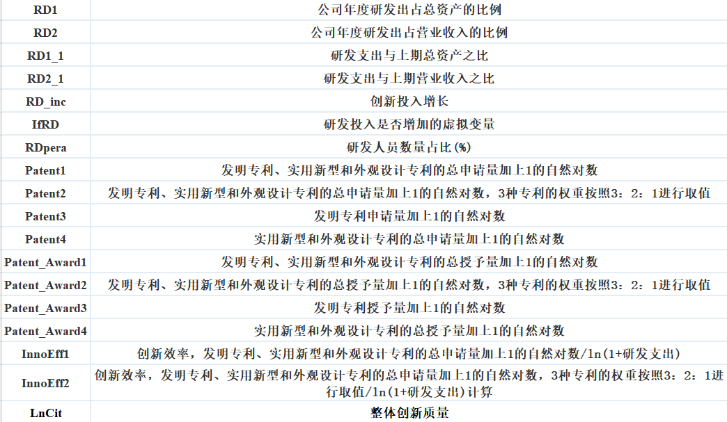 作者收集了各类期刊对于创新的衡量,包括但是不限于创新投入、创新产出、创新效率、创新质量、专利申请、专利引用等,供大家参考使用,所有的内容都有处理流程以及原始数据,且均为最新2022的数据
