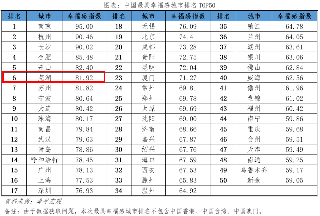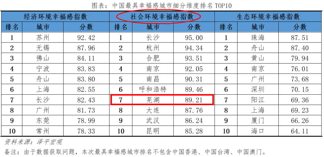 [color=rgba(0, 0, 0, 0.9)]△在细分榜单“社会环境幸福感指数”上,芜湖进入前十。