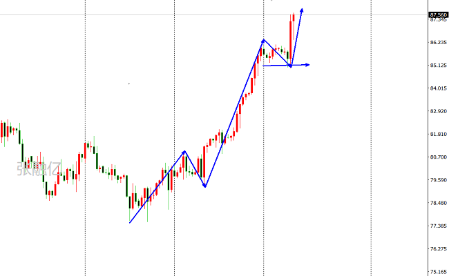 原油周二出现了震荡上涨走势,在多次触及85.0水平之后,油价出现了企稳拉升,最高点触及87.4区域遇阻调整。原油日线走势图上看,日线级别连阳上涨,在周一十字星之后,油价再次上破新高,进一步表明多头再次上移一个台阶,后市延续看涨。四小时级别上看,布林带开口向上,均线粘连后金叉向上发散中,原油多头在77.5水平双针探底后,多头的一波连续上涨五浪,上方强弱一线在88.2水平,进一步上破后需要关注,前期阻力位在90整数关口。综上所述张融亿总结:原油多头持续发散中,后市操作上考虑回撤布局多单为主,高空为辅,上方关注88.2-89.0美元阻力,下方关注86.0-85.0美元支撑。