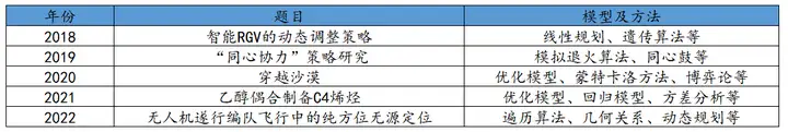 B题难度一般介于A题和C题之间,题型一般不固定,大部分还会考察优化模型,也会考察预测、分类模型等。近五年国赛B题考察的题型参考如下: