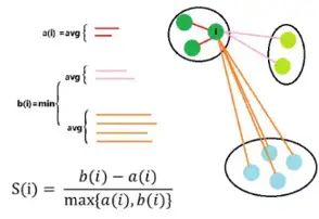 轮廓系数适用于实际类别信息未知的情况,结合凝聚度和分散度,计算如下: