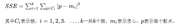 从图片上来看SSE(左图)>SSE(右图),同时也可以看出左侧更稀疏右侧更密集,SSE想要达到最优解,还需要初始聚类中心的选择,否则只能达到一个局部最优解,初始聚类中心的选择可以参考“肘部法”,一般认为“拐点”即下降率突然变缓慢时,认为此点为最佳k值。比如: