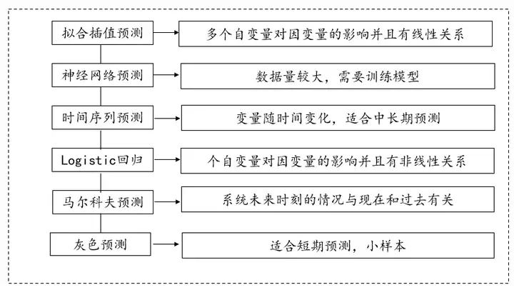 灰色预测一般适用于小样本数据进行预测,马尔科夫链常用于地理或者市场占有率的预测,销售期望利用的预测等等,微分方程常用的模型有传染病模型。理想火箭模型、人口模型等。也可以用于疾病的传播预测等。以及还有其它SVM、小波分析等预测方法。