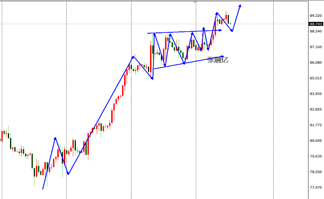 原油今日多次触及89.6区域之后,油价出现了高位回落走势。原油在突破88一线,再次转换看多。日线经过长时间的星K线整理蓄势,昨日放量破高,创新高至89.6.且收在盘在高位,日线收稳,多头延续行情,浪形进一步的扩张。4小时此前在85.0低点上方横向整理启稳,昨日进一步突破高点,那么85.0可作为二浪的延伸临界点,多头进一步的向上放量。综上所述张融亿总结:原油多头高位震荡中,后市操作上考虑回撤布局多单为主,高空试空为辅,上方关注89.6-90.6美元阻力,下方关注87.7-87.0美元支撑。