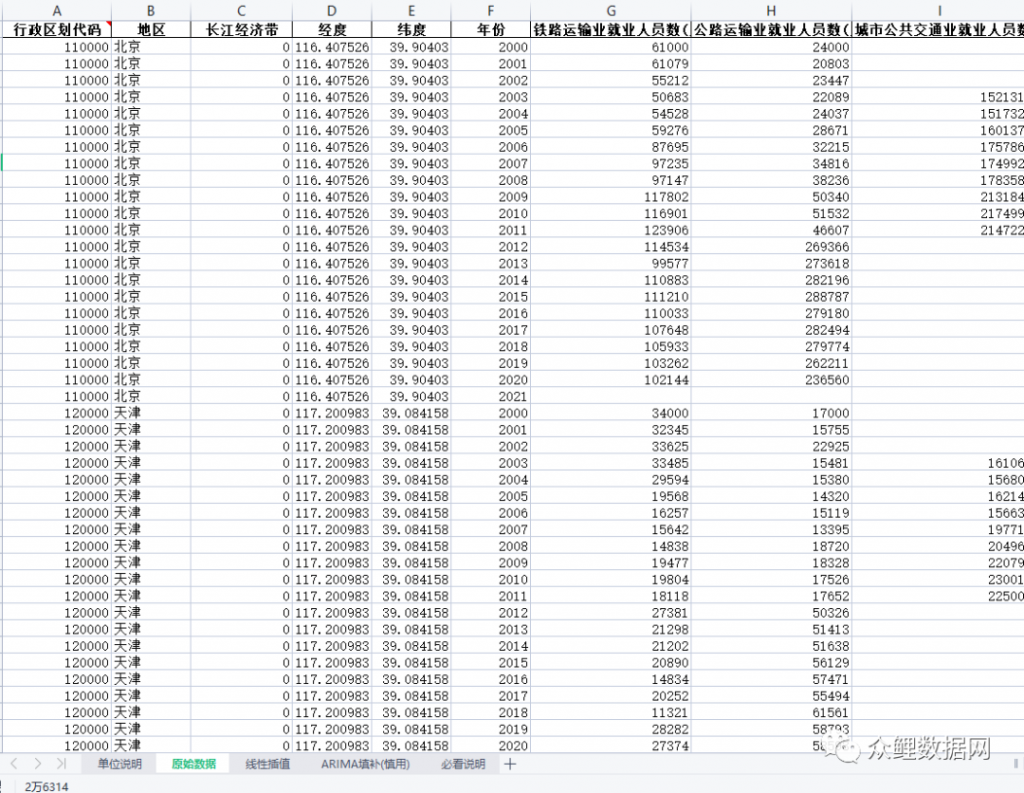 本数据选取了全国各地区-互联网、邮电和运输181个相关指标2000年-2021部分指标体系如下:单位说明,原始数据,线性插值,利用数据的线性趋势,对各年份中间的缺失部分进行填充,得到线性插值版数据, 还有 ARIMA填补版本。
