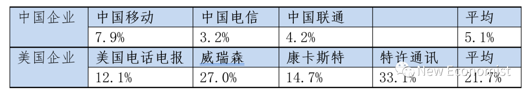 对上榜的中美企业的经济效益进行一些比较分析,可以发现,中国企业仍然存在较大差距。由于2022年公布的榜单实际上显示的是2021年的经营数据,中国企业2021年受新冠疫情影响远低于2022年,所以这些数据有较强说服力。总体而言,中国大陆上榜企业平均营业收入利润率为5.1%,总资产收益率为1.2%,净资产收益率则为9.5%,美国上榜企业分别为11.0%、3.2%和21.9%。中国大陆上榜企业有10家银行,其利润占上榜中国大陆企业全部利润近42%;126家中国大陆非银行上榜企业平均利润为26亿美元,而117家美国非银行上榜企业平均利润为92亿美元。在营业收入利润率最高的50家企业中,美国有23家,包括微软、甲骨文、Meta(脸书改名后的公司)、Alphabet(谷歌的母公司)、苹果、高通、思科、辉瑞、英特尔、强生等企业;中国大陆只有6家,其中5家是银行,其他1家非银行企业是腾讯。在净资产收益率最高的50家公司中,美国有25家,相当一部分企业也正是营业收入利润率最高的那23家企业;中国大陆有3家,分别是中国医药、联想集团、山东钢铁。从这些数据可以看出,中国金融业之外的这些大企业排头兵,与美国金融业之外的大企业排头兵相比,经济效益有很大差距。而中国这些大企业排头兵,其中许多还被认为是中国相应行业的龙头企业,以及盈利能力很强的企业;并被遴选为世界一流示范企业或一流专精特新示范企业,譬如中国石油、国家电网、中国建筑、中国宝武、中国移动、上海汽车、航天科技、中国中车等上榜企业,以及中国核工业、航天科工、中国船舶、安徽海螺等上榜企业,要么在一流示范企业名单上,要么其子企业在一流专精特新示范企业名单中。即使对同行业的企业进行比较分析,效益差距同样明显。金属制品行业具有很强的可比性,因此这个行业在中国和其他国家一样都具有很高的市场化程度。在金属制品行业,中国大陆上榜世界500强的企业有19家,但平均利润额只有11亿美元,净资产收益率排名最高的山东钢铁为40.3%、中国宝武为6.1%、河北钢铁集团为2.0%、首钢集团为1.1%;美国上榜企业只有1家,即纽柯钢铁公司,其利润总额为70亿美元,净资产收益率达到48.7%;其他国家的上榜企业也有较好的效益指标,譬如卢森堡的安赛乐米塔尔的净资产收益率为30.5%,韩国浦项制铁为13.6%,日本制铁为19.9%。一些人可能会认为,中国金属制品行业的产业集中度较低,存在过度竞争情况,从而导致利润率太低。但从单个企业的产量规模来看,中国企业普遍更高一些,而且各有其比较稳定的客户群体和市场范围,经过2016年前后结构性改革期间的“去产能”之后,并不存在明显的产能过剩和严重的价格竞争等情况,所以,很难从产业组织角度来完全解释利润率的巨大差距。可能电信行业更具可比性,该行业进入世界500强的中国大陆和美国企业数量相差很小,各为3家和4家。该行业的对外开放程度不高,本国用户人数对企业规模和效益的影响非常大,这方面中国企业更有优势。从设备先进程度和技术迭代角度来看,中国企业也不处于劣势。下表是两国企业的净资产收益率的对比。表1 中美电信企业的净资产收益率对比(2021年经营数据)