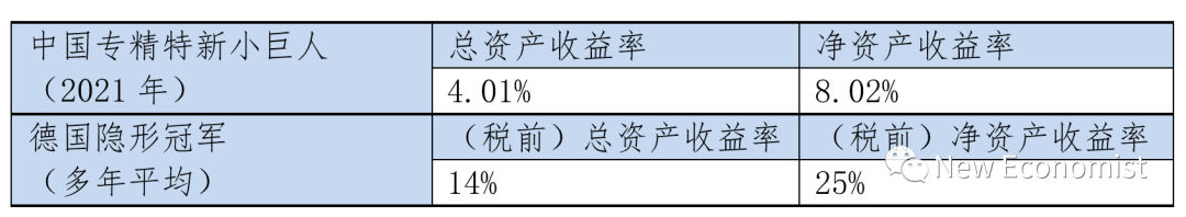 资料来源:作者收集与计算上表中的中德企业的资产收益率计算,很可能存在计算口径上的差异,即德国企业为税前总资产收益率,而中国企业可能为税后总资产收益率。但即使将德国企业的资产收益率调整为税后,也可以肯定,德国隐形冠军企业创造经济效益的能力,明显高于中国专精特新小巨人上市企业。对这些企业创新能力进行衡量,则可从更深层次来认识它们创造经济效益的能力。德国隐形冠军的研发投入强度达到6%,是一般德国公司的2倍,其创新效率是大企业的25倍;而且许多隐形冠军企业并不申请专利;即使在成熟行业,隐形冠军的创新也层出不穷,而且它们特别重视持续改良式创新。中国专精特新小巨人企业在创新方面也有优良表现。一项统计分析显示,中国专精特新小巨人于2021年共有专利申请48.18万件,平均每户98件,不过这还是明显低于德国隐形冠军每户大约200件的水平;其中有效发明专利平均每户只有13件;专精特新小巨人在A股上市和新三板挂牌的企业,研发投入强度的中位数达到5.6%,远高于中证1000企业的3.7%和创业板全部企业的4.8%。可以看出,中国专精特新小巨人企业中的上市和挂牌公司,研发投入强度已接近德国隐形冠军企业,不过所积累的专利数量则少得多。此外,中国专精特新小巨人企业的专利质量,或者技术含量和有用性,可能也不太高。浙江大学管理学院与安永研究所分析了中国719家上市或挂牌的专精特新小巨人企业的有效发明专利,发现只有8家企业有专利自引用行为,这8家公司的自引用率平均值为0.35,最大值为0.5,其中7家公司仅有1次自引用,另一家公司有2次自引用。这可能从一个侧面表明这些发明的价值偏低。三、一些启示中国将持续有力推进世界一流企业的建设,选入一流示范企业和一流专精特新示范名单的企业,以及选入其他有关名单或获得某些支持的企业,还会继续增加。这些企业及其他许多企业,也在努力提高产品质量和管理水平、努力强化创新和升级。不过从经济效益视角来看,中国被广泛认为比较接近于世界一流的那些企业,与美国、德国的同层次、同行业企业相比,还有明显差距。尽管中国许多行业龙头企业,特别是大型国有企业,以及一些专精特新企业,现在非常注重于保障产业链供应链安全、攻克“卡脖子”技术和实现科技自立自强,以及维护国民经济命脉和社会民生稳定,但是也不应忽视在经济效益上追求世界一流。强大的创造经济效益能力,既是衡量企业竞争力的最终指标,也是持续提高竞争力的根本保障,更是企业高质量发展的有力体现。即使一些创新型企业,相当长时间里,必须大量“烧钱”而造成财务亏损,但一方面也需要以快速的业务增长来证明“烧钱”是值得的,并以此提高在资本市场估值和继续获得投资,另一方面,终究还是需要创造经济效益。特别是资产收益率,比较集中地体现了资本要素投入的创造价值能力,较高的资产收益率意味着投入的资本要素更少、创造的价值更多,意味着更接近于集约型而非粗放型发展方式。即使企业在一个时期的保供能力强,甚至专利授权多,或者市场估值高,但如果处于长期、持续的低盈利状态,甚至亏损状态,企业最终也难以继续保供、创新、融资,或者还会对宏观经济运行和经济增长模式造成负面影响。因此,追求一流效益,应成为建设世界一流企业的一个重要方面。中国那些大企业,和更多的专精特新企业,要显著地改善经济效益,首先还是应该在产品质量和档次上下功夫。德国隐形冠军企业的产品通常有10%—15%的溢价,因为,它们通常以卓越的产品性能和品质来赢得市场份额。如此幅度的产品溢价将会带来经济效益的提高。其次,应该持续不懈地致力于创新。中国许多专精特新小巨人企业的研发强度已经接近于德国隐形冠军企业,但坚持五年十年不难,坚持二三十年和四五十年不易,因为一些高额的创新投入可能十几年都见不到成果,从而引发放弃的思想。此外,许多创新并不具有革命性,而是通过长期改良才能集腋成裘。再次,经营管理、工艺技术的精益化非常重要。仅有创新精神,忽视工匠精神,也难以涌现数量较多的世界一流企业。最后,在数字化时代,借助于数字化加快企业升级转型,并且构建和融入数字化生态,也非常重要。对于国有企业而言,应该加快市场化改革和公司治理转变。国家则应该为各类企业创造公平竞争的市场环境,并为整个社会营造诚实、厚道、有合理良好预期的长期主义发展环境,就这一点而言,能否涌现出一批世界一流企业,不仅仅是企业界的事情。