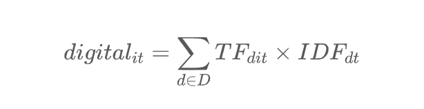 本文构建了反映上市公司数字技术应用程度的指标( digital )。已有文献通常采用无形资产中软件资产余额等代理指标来测度数字赋能水平,但这一做法容易低估企业应用数字技术的真实状况,故本文运用Python爬虫和文本挖掘技术搜集和整理上市公司年报中有关数字技术应用的相关信息。通过拆分和提取其中有关数字技术应用的关键词,我们以这些关键词在年报中的逆文档概率词频(TF-IDF)衡量一个企业在特定年份的数字赋能程度( digital ),具体见下式。