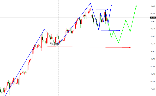 美原油市场高位区间整理,周初行情开盘在90.82美元/桶,后行情先拉升,周线最高触及到了92.94美元/桶,后行情冲高回落,周线最低给到了88.75美元/桶,后行情整理,周线最终收线在了90.72美元/桶,后行情以一根上下影线极长的长脚十字星形态收线,而这样的形态收尾后,原油延续震荡思路。原油四小时图解析得知,上一个交易日先涨后跌再上涨形成窄幅震荡走势,自从原油从高位冲高回落以来一直是处于震荡调整之中,油价一旦放量突破并且站稳91.00一线将会继续回归震荡上行。综上所述张融亿总结:原油多头趋势中高位震荡中,今日操作上考虑低多为主,高空为辅,上方关注91.3-92.4美元阻力,下方关注89.0-88.0美元/桶。