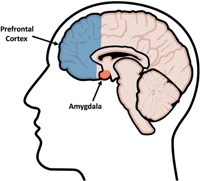 每当我们面临令人神经或情绪紧张的挑战时,大脑深处一个叫做杏仁核的中枢就会启动。杏仁核可以触发全面的身体反应,让我们为面临的挑战或威胁做好准备。这种“逃跑或战斗”的反应会加快我们的心率,并使得压力荷尔蒙涌入我们的血液。幸运的是,我们和这一系列过度兴奋反应之间有一个脑区:前额叶皮层,即眉心后面的脑区。研究表明,该区域的活动往往会抑制或下调杏仁核,从而控制我们的情绪反应[9]。