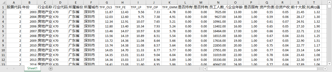 股票代码 年份 行业名称 行业代码 所属省份 所属城市 TFP_OLS TFP_FE TFP_LP TFP_OP TFP_GMM 是否持有银行股份 是否持有其他金融机构股份 员工人数_个 企业年龄 是否国有企业 资产负债率 总资产收益率 前十大股东持股比例 托宾Q值