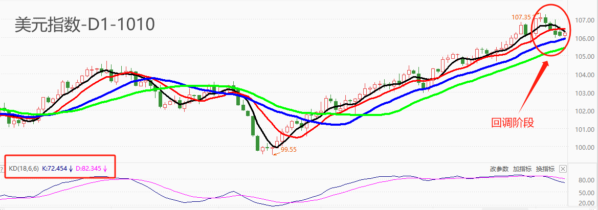 技术角度看,美元指数最近五根K线四阴一阳,且阳线幅度较小,短线回落态势显著。中长期均线依旧呈多头发散排列,中短期均线已经向下交叉,表明长期涨势未改,但短期陷入下跌。KD指标的读数分别为72/82,依旧处于偏高状态,下跌仍有充足空间。综合来看,美元指数的中期多头趋势得到多指标验证,短期跌势预计不会持续太久,寻得可靠支撑后即可重启涨势。