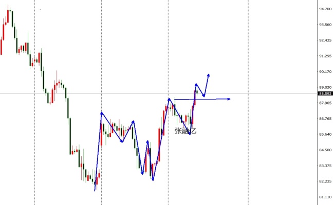原油市场昨日开盘在87.03美元/盎司,后行情先回落,日线最低给到了85.56美元/盎司,后行情强势拉升,日线最高触及到了87.69美元/盎司,后行情整理,日线最终收线在了87.62美元/盎司,后行情以一根下影线极长的锤头形态收线,而这样的形态收尾后,今日的行情回踩依旧多。4小时图在中轨附近慢慢整理回升,结合双低81.50 82.30构造的双底回升结构。目前突破颈线之后在震荡向上,有轻微站稳颈线之上的迹象。小时图结合昨日的回撤低点,也是中轨的支撑点逢低做多。综上所述张融亿总结;原油处于一个楔形震荡中上破了,今日操作上考虑回撤布局多单为主,高空为辅,上方关注89.3-90.3美元阻力,下方关注87.5-87.0美元支撑。