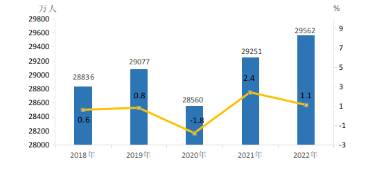 根据《2022年农民工监测调查报告》,2022年全国农民工总量29562万人,比上年增加311万人,增长1.1%。其中,本地农民工12372万人,比上年增加293万人,增长2.4%;外出农民工17190万人,比上年增加18万人,增长0.1%。年末在城镇居住的进城农民工13256万人。