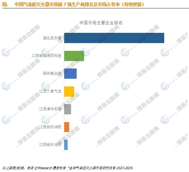 中国范围内气溶胶灭火器生产商主要包括湖北及安盾、江西致远消防科技、深圳联众安等。2022年,中国前三大厂商占有大约55.0%的市场份额。