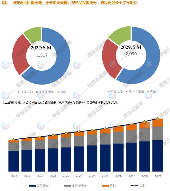 就产品类型而言,目前镍氢电池是最主要的细分产品,占据大约63.1%的份额。