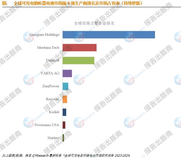 全球范围内可充电助听器电池生产商主要包括Energizer Holdings、Montana Tech、Duracell等。2022年,全球前三大厂商占有大约79.0%的市场份额。