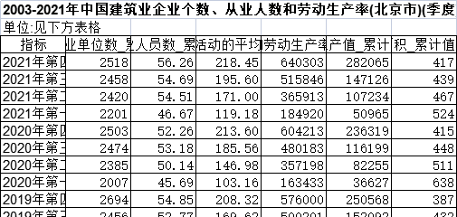 [经管数据集] 2003-2021年中国建筑业企业个数、从业人数和劳动生产率(北京市)(季度) |