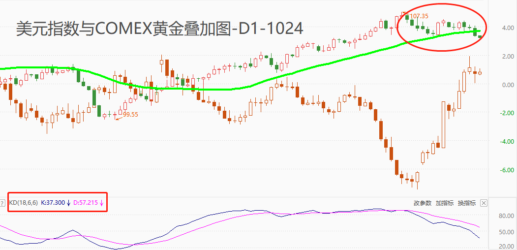 技术角度看,美元指数在10月3日创出近期新高107.35之后便开启回落走势,至今日累计跌幅达到1.5%。中期趋势多空分界标准MA30均线已经被跌破,如果未来三天的日收盘价不能重回均线上方,则“多转空”的技术形态得到确认。暗红色K线为COMEX黄金的走势图,在美元指数回落的这段时间里,COMEX黄金价格出现8.4%的涨幅,期间最高点达到2009.2美元,突破关键阻力位2000美元。黄金的上涨除了受美元指数回落的影响外,还受到巴以冲突的紧张局势持续升级影响。目前看来,两项对黄金的利多因素短时间内都不会消失,COMEX黄金仍有继续上涨的动力。