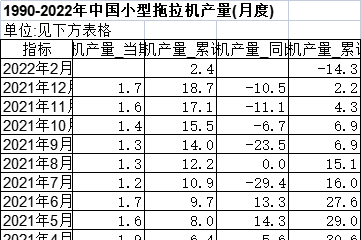 [经管数据集] 1990-2022年中国小型拖拉机产量(月度) |