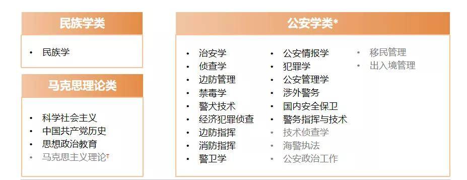 法学门类中,包含了6个学科大类,分别为法学类、政治学类、社会学类、民族学类、马克思理论类、公安学类。