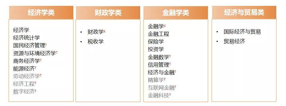 经济学门类中,包含了4个学科大类,分别为经济学类、财政学类、金融学类、经济与贸易类。