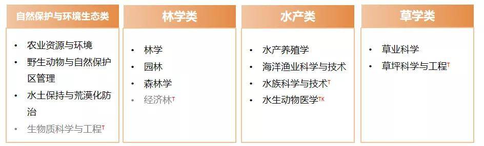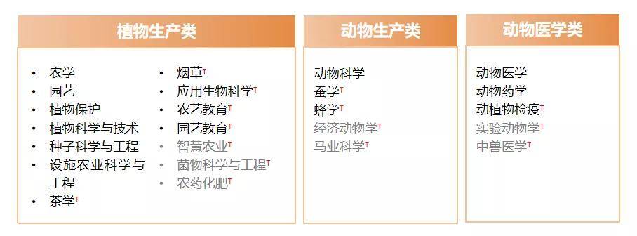 农学门类下,包含7个学科大类,分别是植物生产类、动物生产类、动物医学类、林学类、自然保护与环境生态类、水产类、草学类。