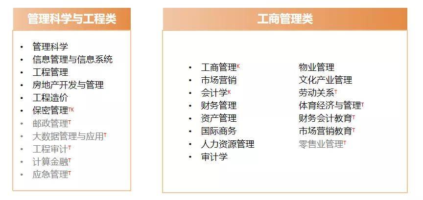 管理学门类中,包含了5个学科大类,分别为管理科学与工程类、工商管理类、工业工程类、电子商务类、旅游管理类。