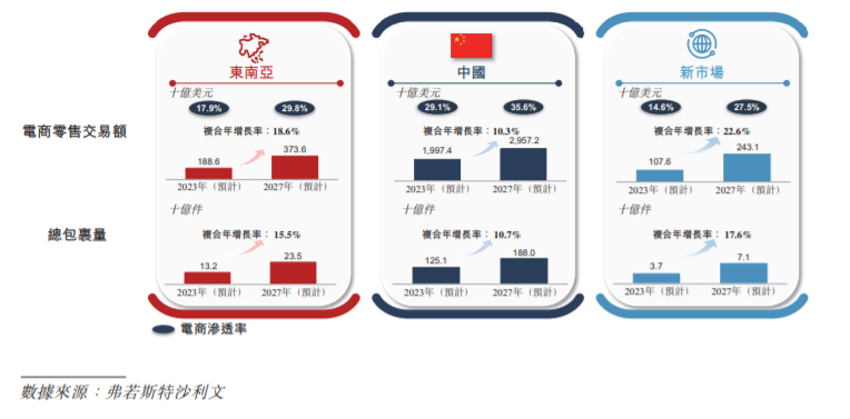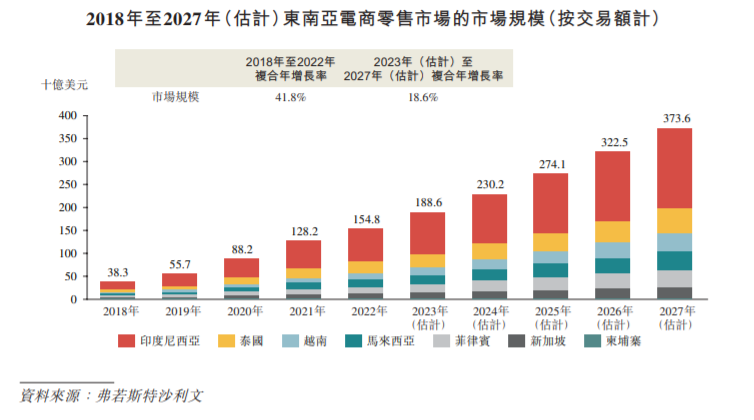 图片来源:极兔招股书极兔在东南亚发展的如此迅速,首先占了很大一部分时势因素,赶上了东南亚电商崛起的浪潮。东南亚是世界上增长最快的地区之一,GDP从2018年的29597亿美元增至2022年的35257亿美元,推动了东南亚电商零售及快递市场发展。
