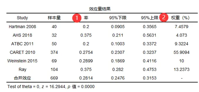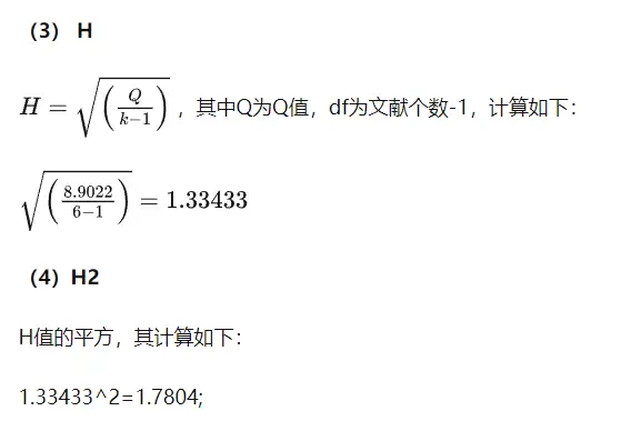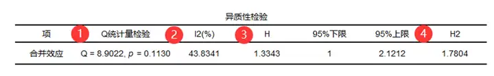 异质性分析中Q值、I2等如何计算呢?异质性分析在很多方法中都有体现。比如在me ta分析中,SPSSAU结果如下(以固定效应为例):