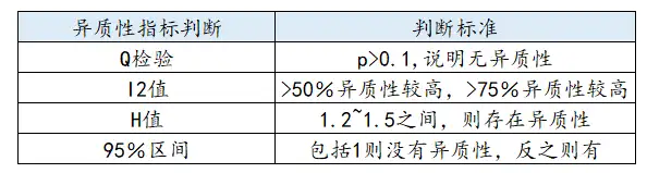 可以使用异质性检验进行异质性分析,结论更加客观,其中包括:Q检验,I2值判断,H值判断等。通常情况下Q检验时p 值>0.1,即说明无异质性(即同质性);I2指标衡量组间异质性的占比情况,通常I2大于50%时认为异质性较高,I2大于75%时认为异质性过高;通**常H值大于1.5则说明存在异质性,H值小于1.2说明不存在异质性问题,**如果H介于1.2 ~ 1.5之间时,如果95%区间包括1说明没有异质性,反之说明具有异质性。