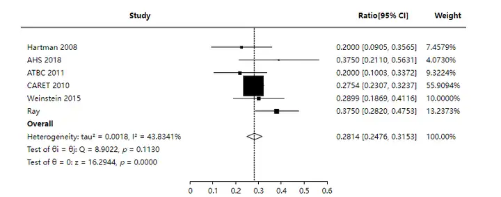 也可以用图形进行分析,比如森林图、Galbraith 图法、L’Abbe 图等。比如森林图举例如下: