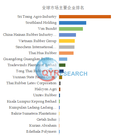 全球范围内,天然橡胶主要生产商包括Von Bundit、Sri Trang Agro-Industry、Southland Holding、Thai Hua Rubber、Vietnam Rubber Group、 Tradewinds、lantation Berhad、Tong Thai Rubber Group和Thai Rubber Latex Corporation等,其中前十大厂商占有大约43%的市场份额。