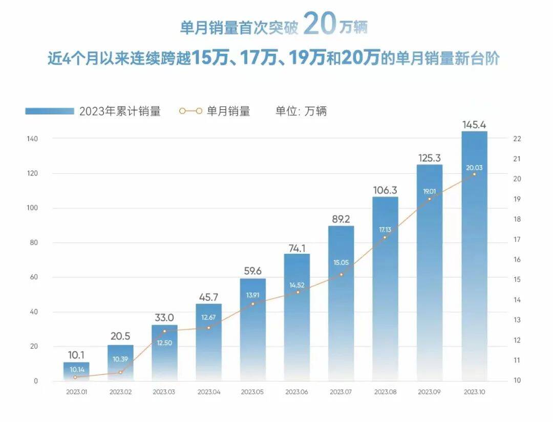 [color=rgba(0, 0, 0, 0.9)]从奇瑞2023年销量表现来看,第一个月是10.1万辆,其后每个月都稳步攀升,到了下半年也就是7月份,突然像股票遇到重大利好一般,呈现涨停式飞跃,连续4个月直接从月销量15万辆冲击到20万辆,前10个月销量已经达到了历史性的145万多辆。