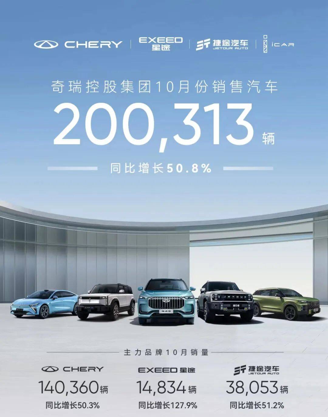 据悉,这也是近4个月以来,奇瑞集团连续跨越15万、17万、19万和20万的单月销量新台阶,屡创历史新高。1—10月份,奇瑞集团累计销售汽车1,453,550辆,同比增长41.6%。