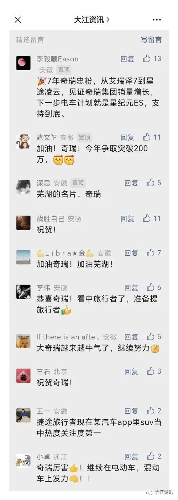 奇瑞取得的辉煌成就,更是让芜湖感到无限荣光。当10月份销量数据在今天公布后,可以发现无论是朋友圈还是各个工作群里,无论是奇瑞员工或是汽车配套企业从业者,抑或是普通的芜湖市民,大家一致对奇瑞持续坚持“技术奇瑞”“国际奇瑞”“用户奇瑞”理念而深感钦佩,一致对芜湖诞生了这样一家伟大的企业而深感自豪!