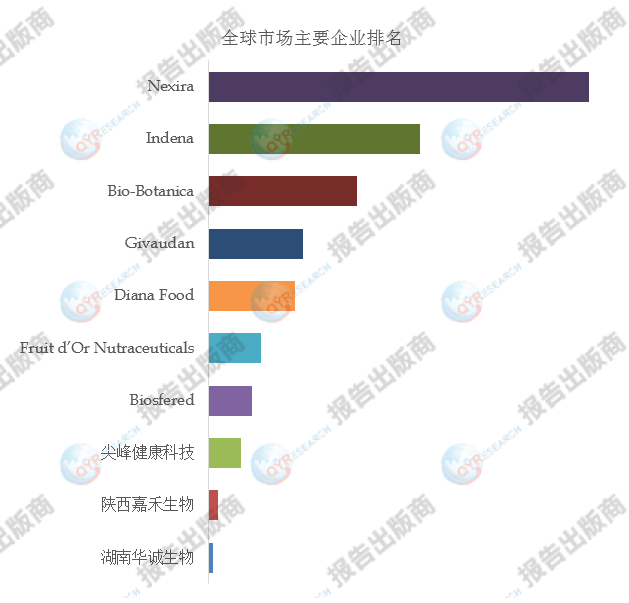 全球范围内,蔓越莓提取物主要生产商包括Diana Food, Givaudan, Bio-Botanica, Indena, Nexira等,其中前五大厂商占有大约61.9%的市场份额。