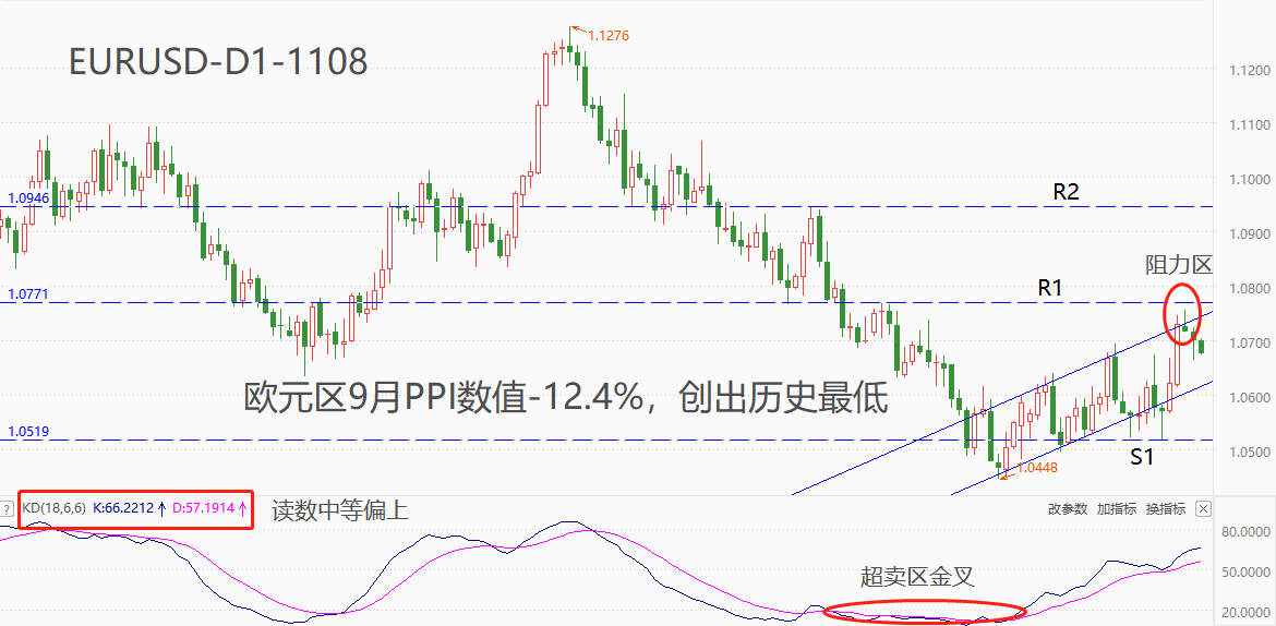 技术角度看,EURUSD处于中期下跌趋势的反弹阶段,并且自10月3日以来的反弹走势不够流畅,经常出现明显的折返走势。上升通道线的上下轨道已经被验证具有支撑/阻力作用,本轮通道内的小级别下跌走势大概率会触及下轨。第一阻力位在9月13日形成的高点1.0766,该点位距离市价1.0681较劲,市价已经受到压制而下跌。第二阻力位如图R2,第一支撑位如图S1 。震荡指标KD的读数处于中等偏上区间,反弹仍有上行空间,10月5日形成的超卖区金叉仍对反弹波段形成支撑作用,