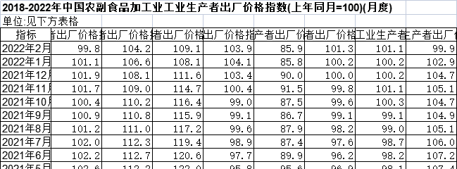 [经管数据集] 2018-2022年中国农副食品加工业工业生产者出厂价格指数 |