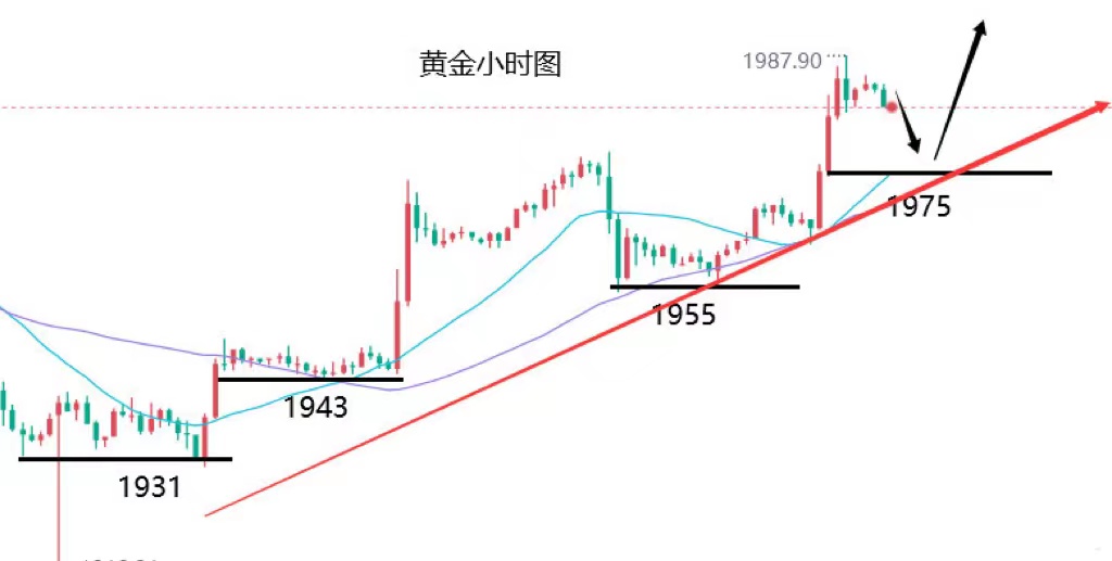 对于昨日黄金价格的上涨,确实令人感到有些意外。我原本预测市场会呈现下跌趋势,但事实上,黄金价格从1956点位开始大幅上涨至1988,多头迎来了超过30个点的涨幅,这一走势确实在意料之外。