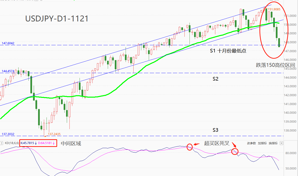技术角度看,USDJPY处于中长期多头趋势下的短期回调阶段,且回调节奏较快,短时间内出现近3%的跌幅,今日最低价已经突破10月以来最低点。最近五根K线一阳四阴,且阴线幅度逐渐增大,短期空头极为占优。中长期上升通道下轨和MA30中期均线均已在本周一被有效跌破,中期趋势可以判定为“多转空”。支撑位S1已经被突破,支撑位S2是下一个回落目标,S3距离市价较远,为7月14日以来的最低点,年内触及该支撑位的可能性不大。震荡指标KD的读数处于中间区域,10月4日和10月30日超买区形成的死叉仍在对跌势起到助推作用,在KD读数进入超卖区之前,维持偏空观点。