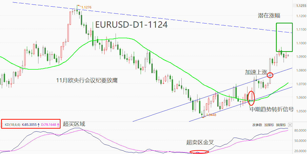 技术角度看,EURUSD处于中期空头趋势转换为多头趋势的初期,11月2日K线站上MA30均线,形成中期趋势由空转多的临界信号,11月6日至10日的下跌回踩,没能跌破MA30,意味着趋势空转多确认。图中蓝色虚线为长期下降通道上轨,市价和上轨之间的距离就是潜在涨幅。不够,考虑到最近六根K线已经形成顶分形阻力结构,预计长期通道所提示的潜在涨幅已经无法实现。震荡指标KD的读数已经进入超买区,意味着10月5日超卖区金叉对上涨行情的提振作用终结,后市存在回调需求。