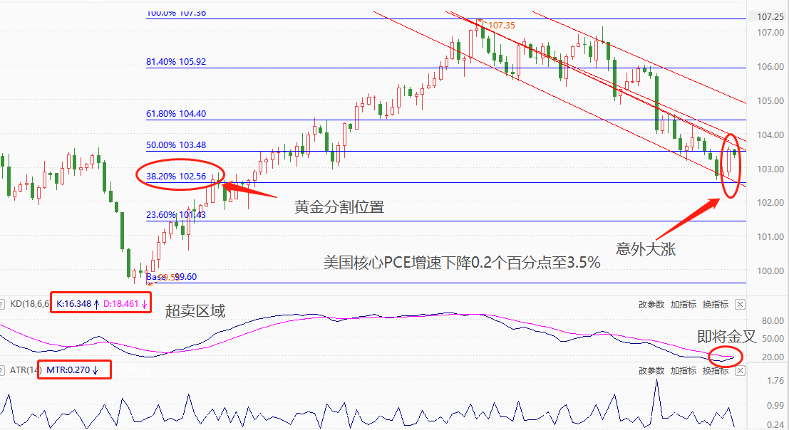 技术角度看,美元指数仍处于中期空头趋势之中,昨日意外大涨,主要是受到了通道下轨的支撑作用。反弹的短期目标位是下降通道中轨,中期目标位是下降通道上轨。震荡指标KD的读数处于超卖区,快慢线即将向上交叉,同样支持美元指数的反弹判定。需要提醒的是,核心PCE数据下降逻辑上对美元指数形成利空冲击,美指昨日的大涨与数据面不符合,可能导致反弹持续性较差。