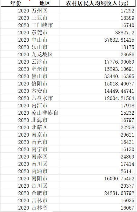 全国各地级市城乡农村居民家庭收入和支出-农村居民人均纯收入1999-2020年
