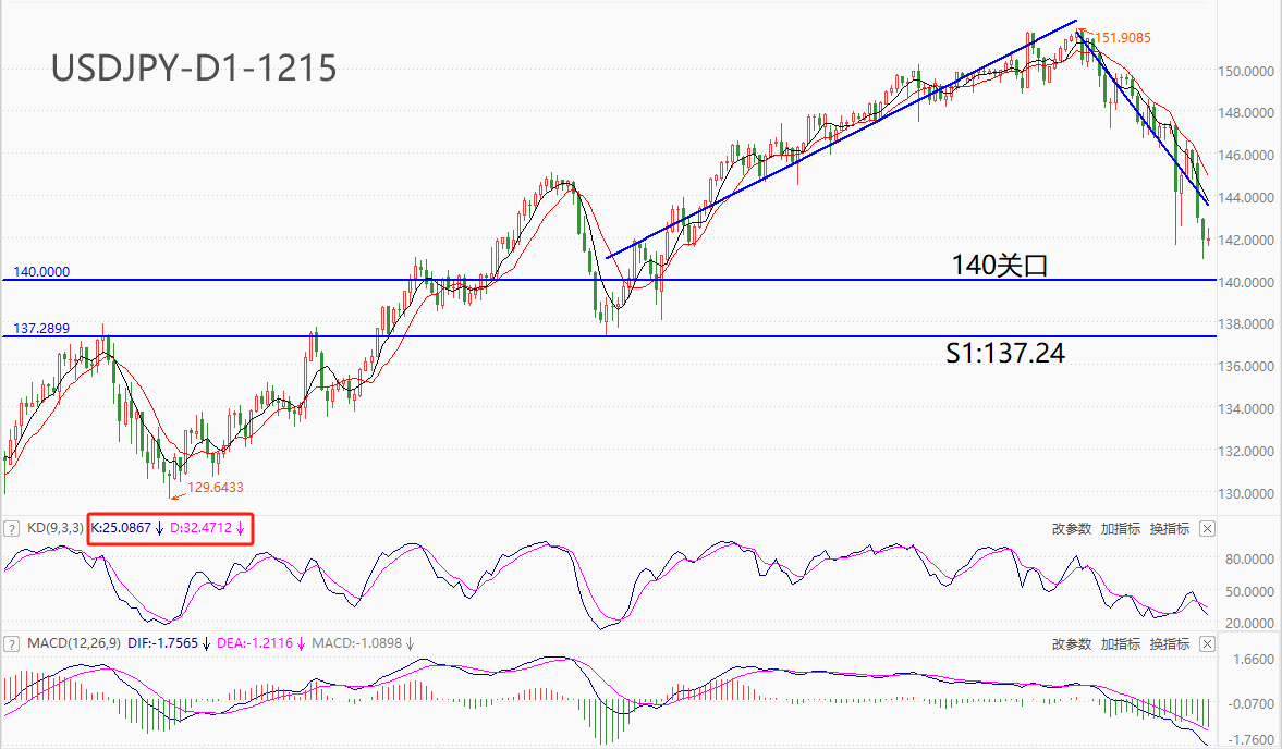技术角度看,USDJPY处于中长期趋势由多转空的状态中。短期均线系统MA5处于MA10下方,呈现空头排列。最近三根K线没有形成底分形支撑的迹象,短线跌势料将延续。距离市价最近的支撑位为140整数关口,一旦跌破则打开下降空间。结构上的第一支撑位S1:137.24为7月14日低点。震荡指标KD的读数已经逼近20的超卖线,一旦进入超卖区并形成金叉,意味着行情将启动超跌反弹。MACD指标的柱状线位于零轴下方,且绝对值不断放大,当期的中期跌势大概率仍将延续。