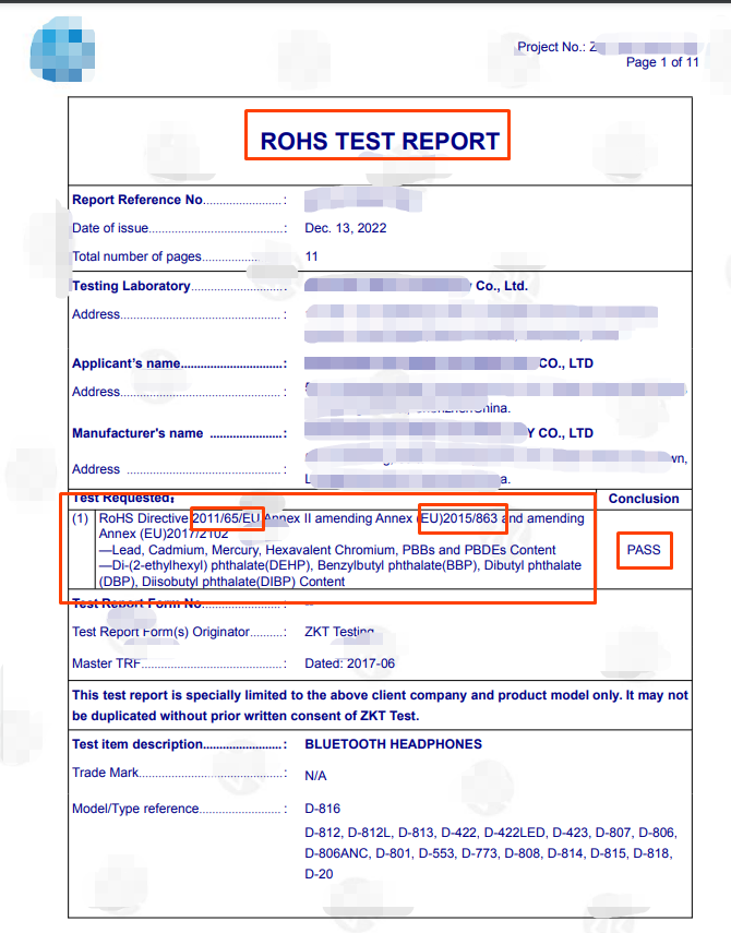 1、测试报告需要符合2011/65/EU or (EU) 2015/863指令