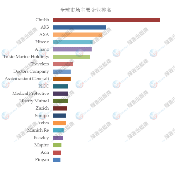 全球范围内职业责任保险生产商主要包括Chubb、AIG、AXA、Hiscox、Allianz、Tokio Marine Holdings、Travelers、Doctors Company、Assicurazioni Generali、PICC等。2021年,全球前十强厂商占有大约37.0%的市场份额。