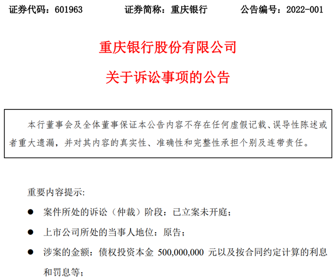 案由是重庆银行于2016年独家认购重庆爱普地产(集团)有限公司(发行时名称为重庆隆鑫地产(集团)有限公司)在深圳交易所非公开发行的私募公司债券“16隆地01”5亿元,重庆爱普公司未能按期支付债券本金及利息。重庆银行以重庆爱普公司及相关担保人为被告提起诉讼。虽然重庆银行胜诉,但重庆爱普公司及相关担保人无可供执行财产,该债券本息始终未能清偿。重庆银行已按照监管部门及内部关于资产风险分类要求,将该债券投资纳入不良,计提相应减值准备。重庆银行经研究认为,该债券发行中的承销商中国国际金融股份有限公司、会计师事务所天职国际会计师事务所、资信评估机构东方金诚国际信用评估有限公司,相关责任人雷晓阳、简福庆、张剑峰、陈泯、程伟、王林强等在债券发行过程中未按法律法规及行业规范履行信息披露职责,《募集说明书》中未如实足额披露发行人负债及对外担保情况,存在虚假记载、误导性陈述及重大遗漏等行为,因此请求判令中国国际金融股份有限公司、天职国际会计师事务所、东方金诚国际信用评估有限公司、雷晓阳、简福庆、张剑峰、陈泯、程伟、王林强对重庆银行相关损失承担连带赔偿责任,赔偿上述债券所导致的债券本金损失 5亿元、债券利息及逾期利息损失199868838.43 元。公告发出后引发了市场的广泛关注,2021年下半年地产行业爆雷潮发生后,部分银行等金融机构纷纷踩雷地产债,本案是其中比较具有代表性的一例。