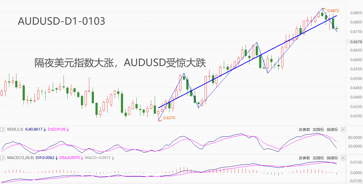 技术角度看,AUDUSD处于中长期多头趋势之中,昨日大跌未能改变上涨结构。最近两个多月,AUDUSD出现三轮上涨波段和两轮回调波段,目前市价正运行于第三轮回调波段当中。市价处于蓝色回归线下方,但由于筑底结构尚未形成,所以向上的回归牵引力暂时无法发挥作用。震荡指标KD的读数处于中等偏下区域,距离20超卖线仍有一段距离,预计短期跌势将会延续。MACD指标的柱线刚刚翻越零轴,中短期趋势已经转空,柱线绝对值较小,短期跌势尚无法影响中期多头趋势。综合来看,多数指标认为AUDUSD短期跌势延续,但寻得有效支撑后将再次顺势上涨。